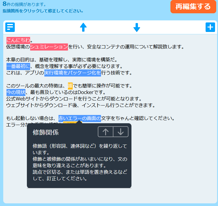| 実行環境をパッケージ化を | 同じ助詞の連続 | O | O | O | O | O |