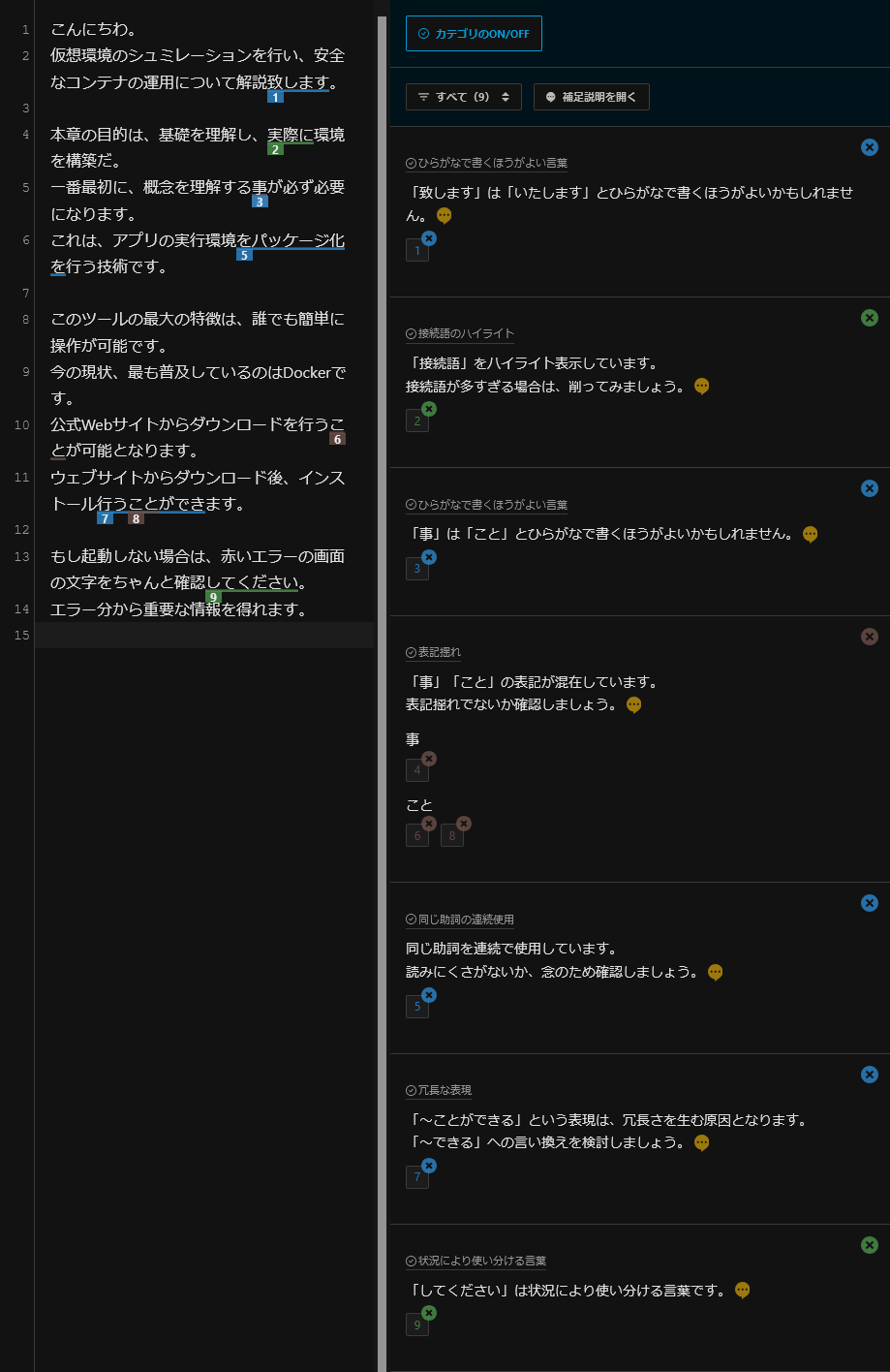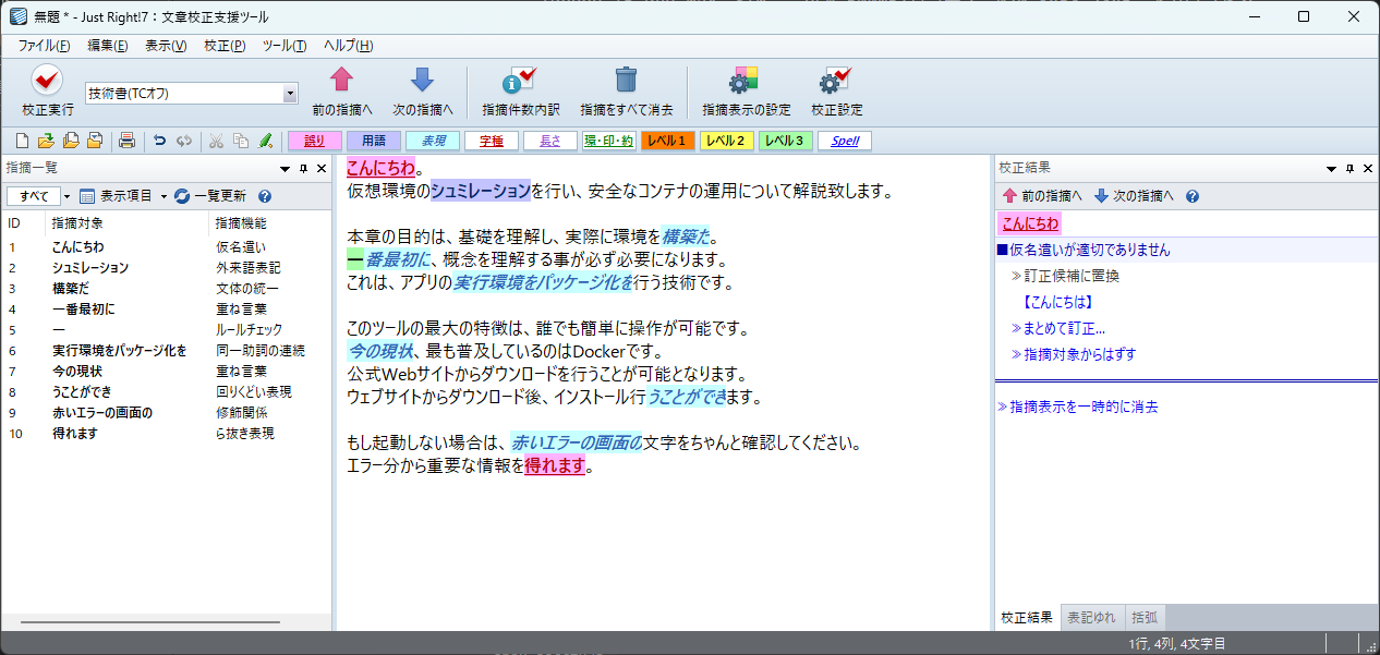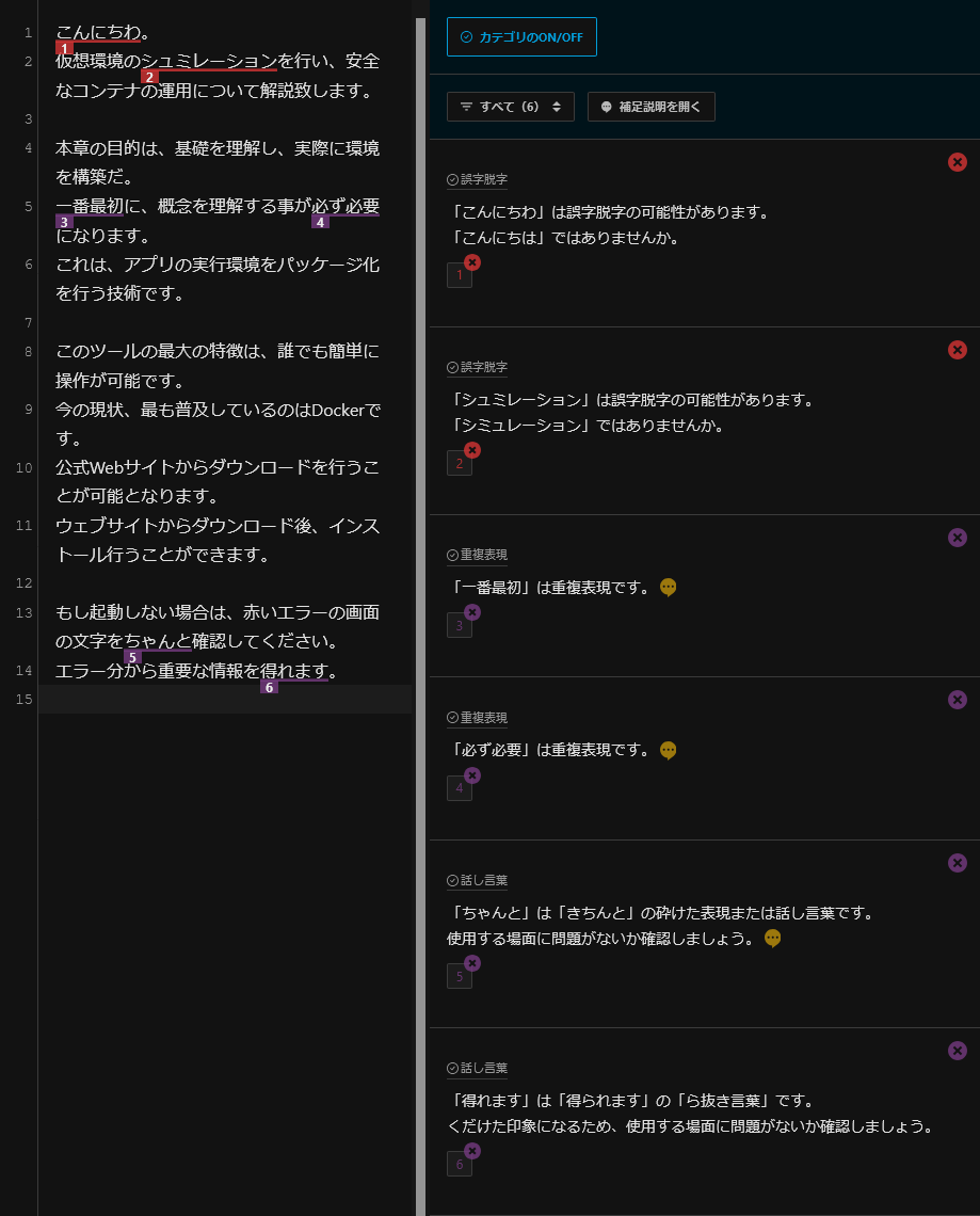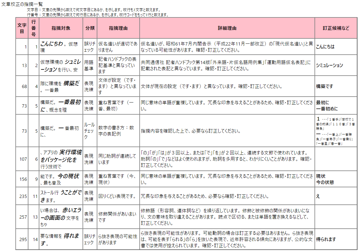 テスト文章の指摘は次のとおり。