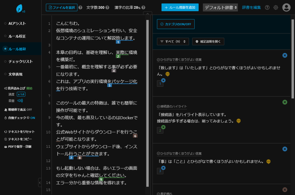 また、デフォルトではやや指摘が弱いので、一般財団法人テクニカルコミュニケーター協会の 日本語スタイルガイド第3版対応ATOK・JustRight!データ集も、追加で入れておくといいかもしれません(このあとのテストでは入れていません)。